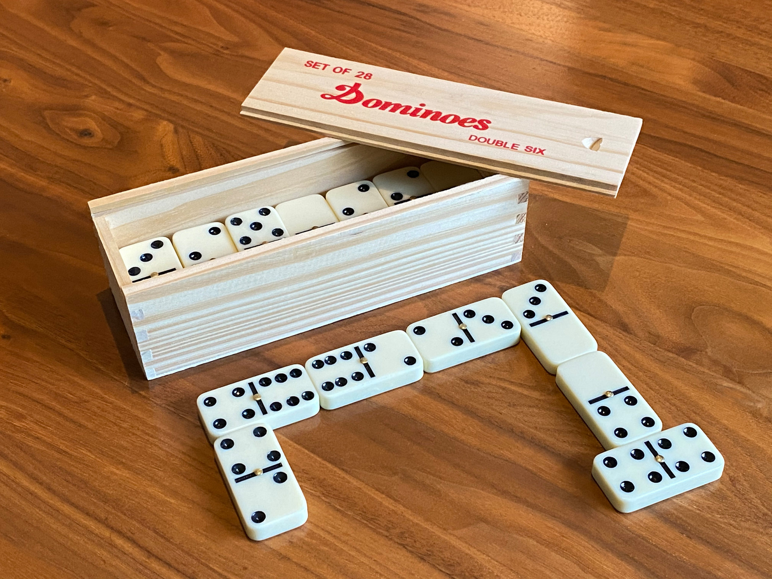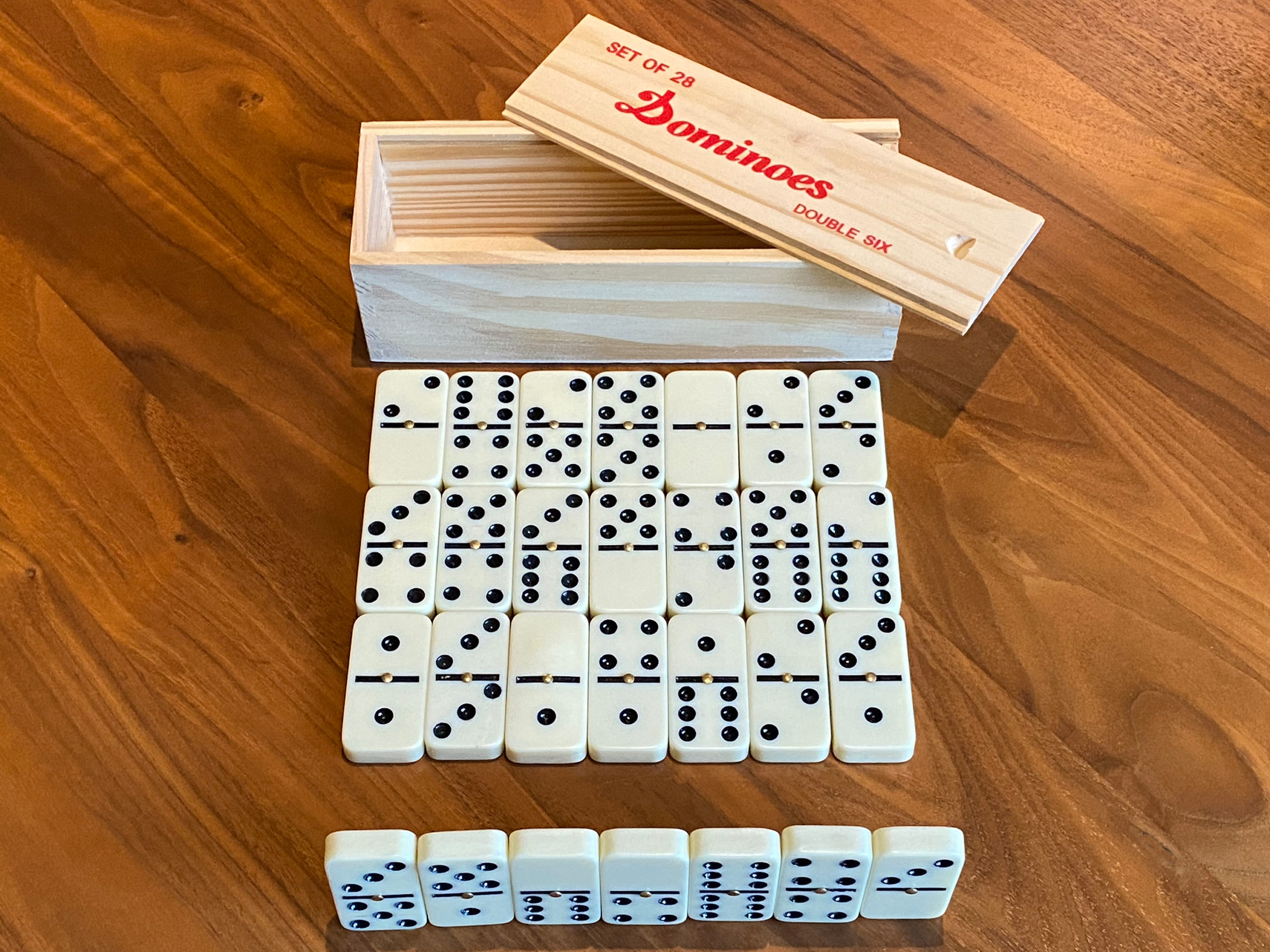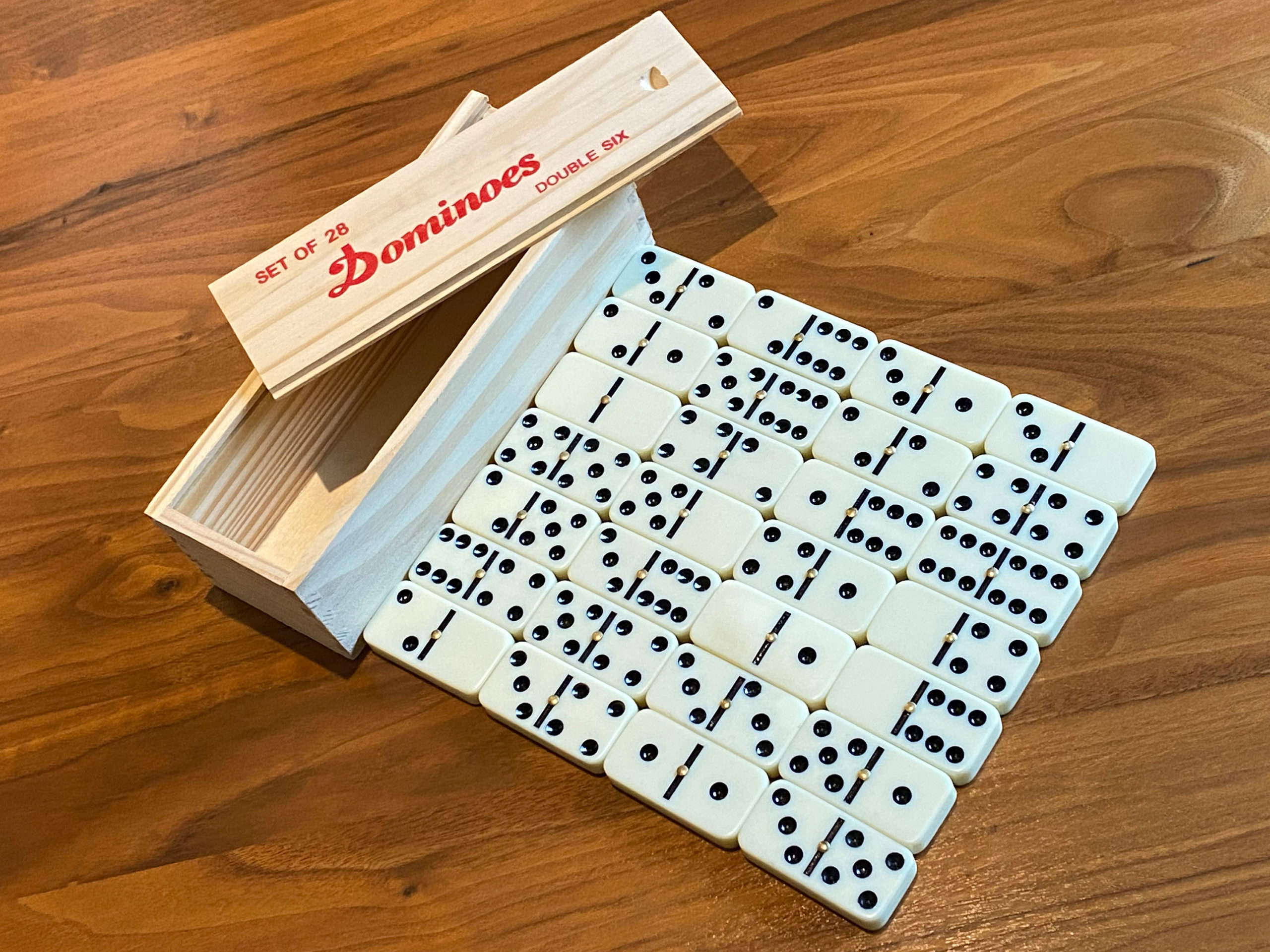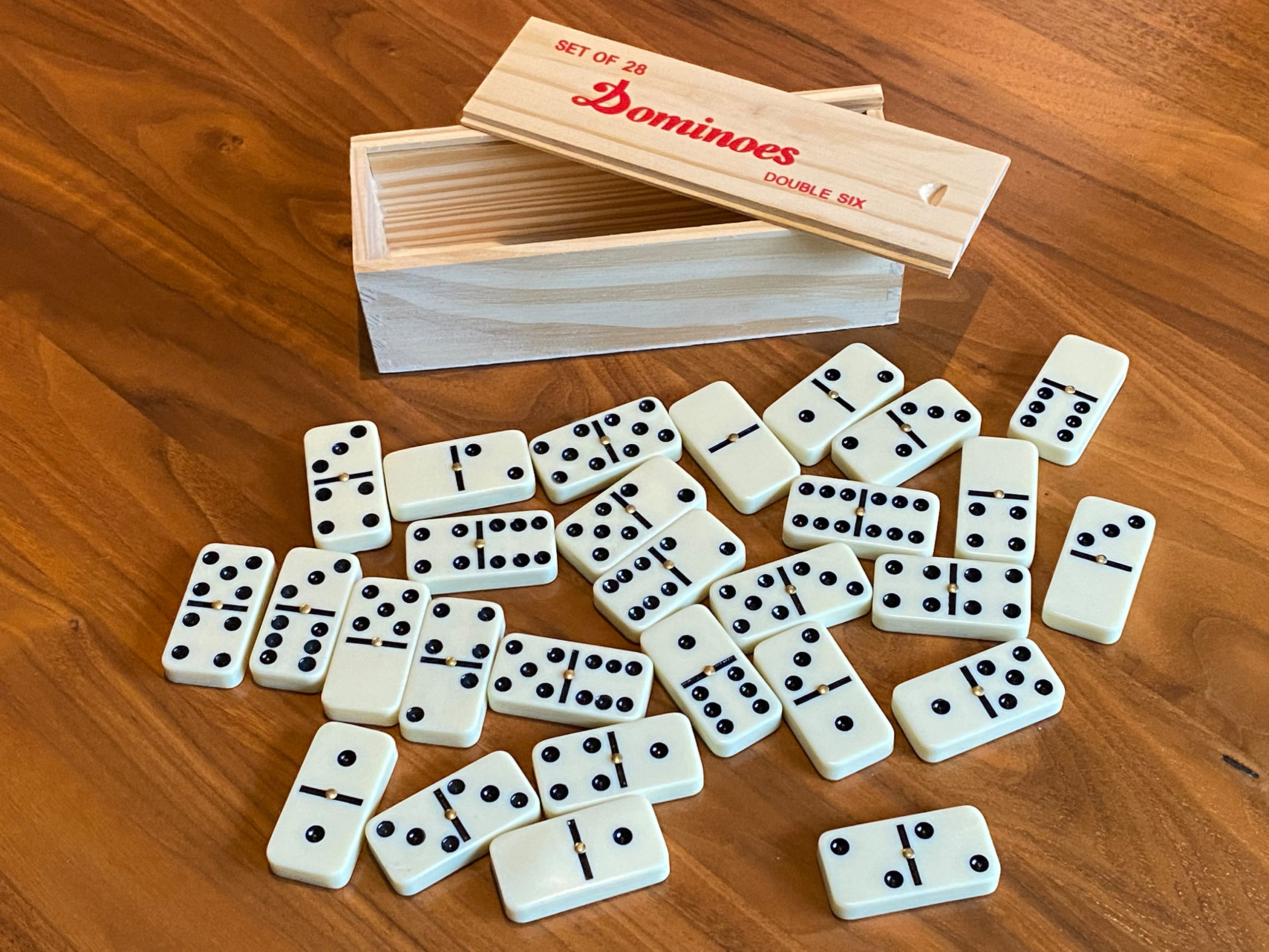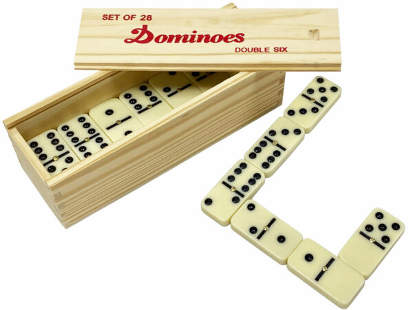 LIEFERUMFANG: 1 Holzkiste mit 28 Profi Dominosteinen, ein Qualitätsprodukt von scarlet play