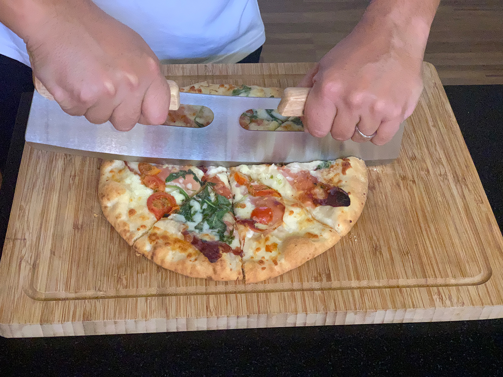 – Äußerst scharfe Klinge. Eine einfache Wiegebewegung von oben und die Pizza ist zerteilt